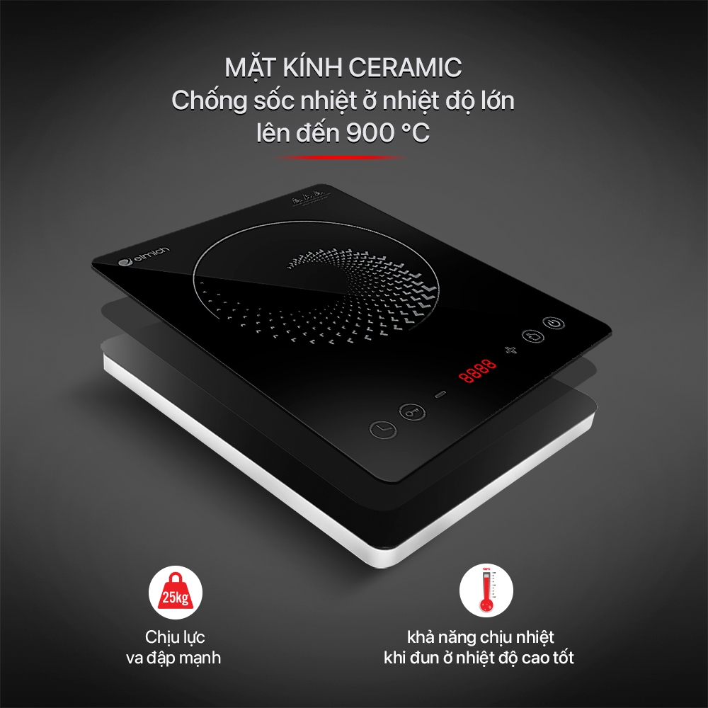 Với kết cấu mặt bếp được phủ kính Ceramic cường lực tương thích với khả năng chống sốc nhiệt ở nhiệt độ cao, cùng khả năng chịu tác động va đập mạnh giúp việc nấu ăn của bạn được đảm bảo an toàn hơn bao giờ hết. Ceramic là chất liệu không những đem lại sự bền đẹp mà còn giúp giảm thiếu việc trầy xước không đang có trong quá trình lau chùi. Với khả năng tải lực lên đến gần 25kg, bạn thỏa thích đun nấu đa dạng món ăn cho gia đình thân yêu của mình.